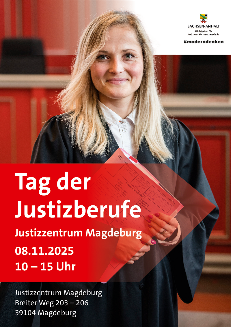 Nach dem großen Erfolg der Premiere im vergangenen Jahr in Halle (Saale) findet am 8. November 2025 der zweite Tag der Justizberufe der Justiz Sachsen-Anhalt im Amtsgericht Magdeburg statt. Interessierte erhalten an diesem Tag spannende Einblicke in die vielfältigen Ausbildungs- und Berufsmöglichkeiten innerhalb der Justiz. Der Eintritt ist frei.